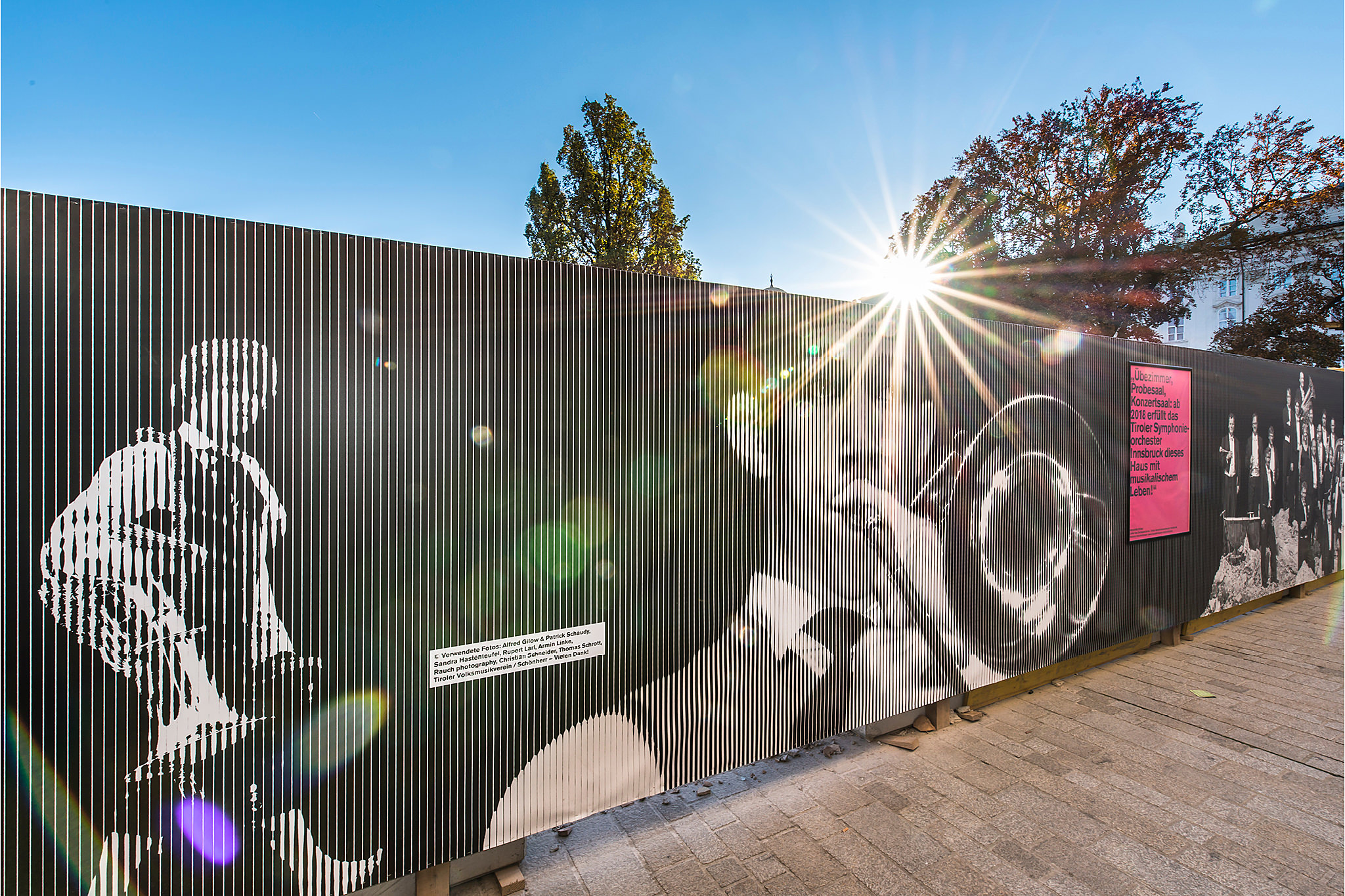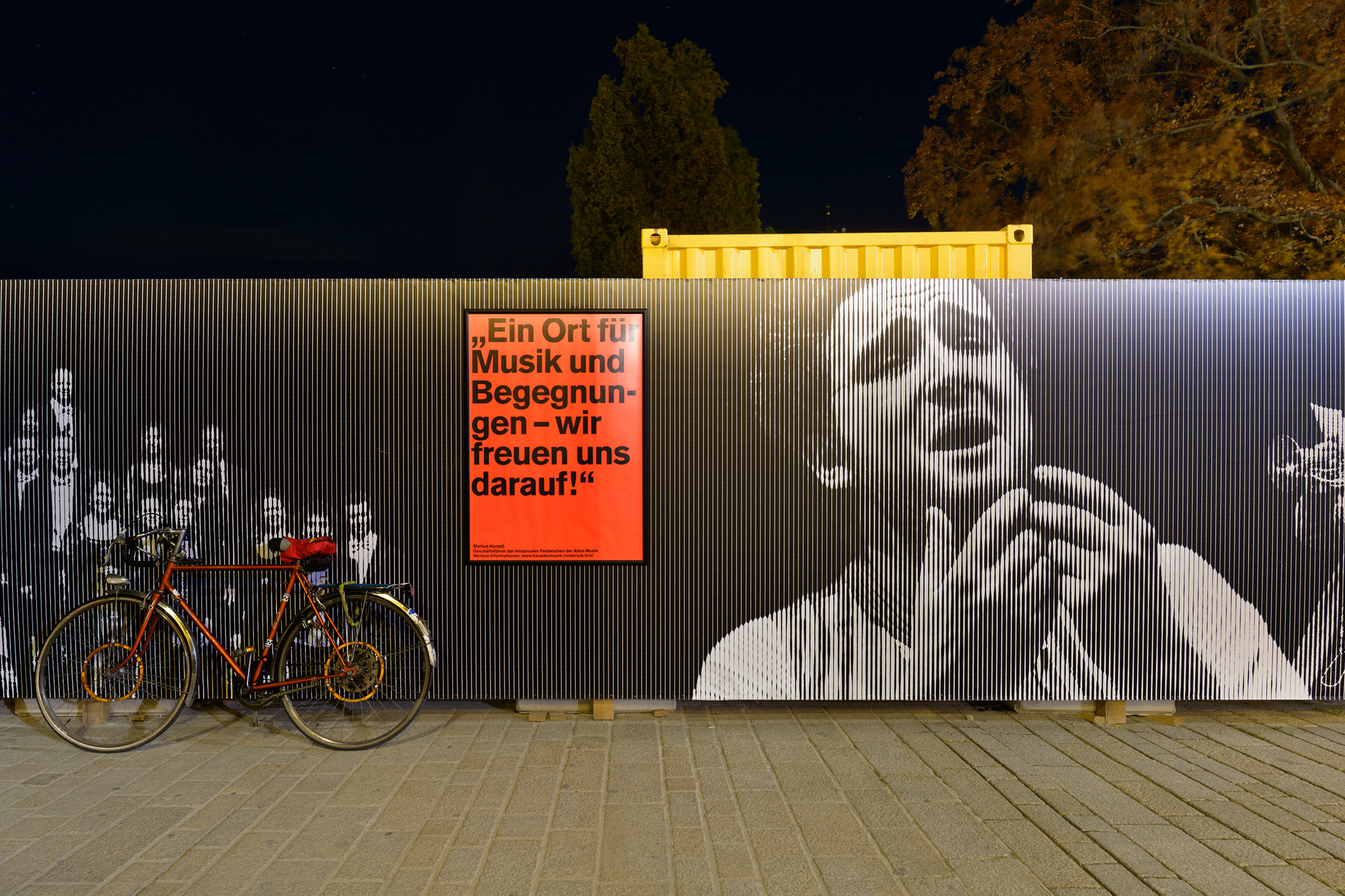 Während der Bauarbeiten greift die Gestaltung des Bauzauns die vertikal gerasterte schwarze Fassade des Gebäudes auf und interpretiert diese als vertikales Strichraster, in das Fotomotive der künftigen Nutzer eingearbeitet sind. In rhythmischen Abständen sind A1-Plakatflächen angebracht, auf denen typografische Plakate mit Zitaten der Beteiligten abgdruckt sind.