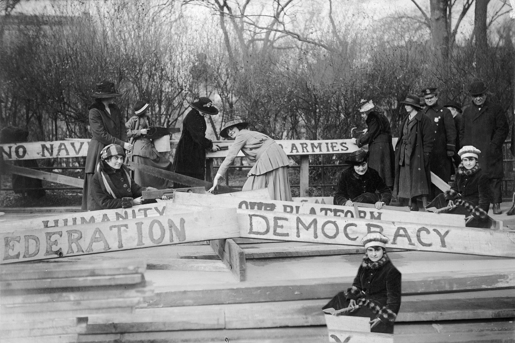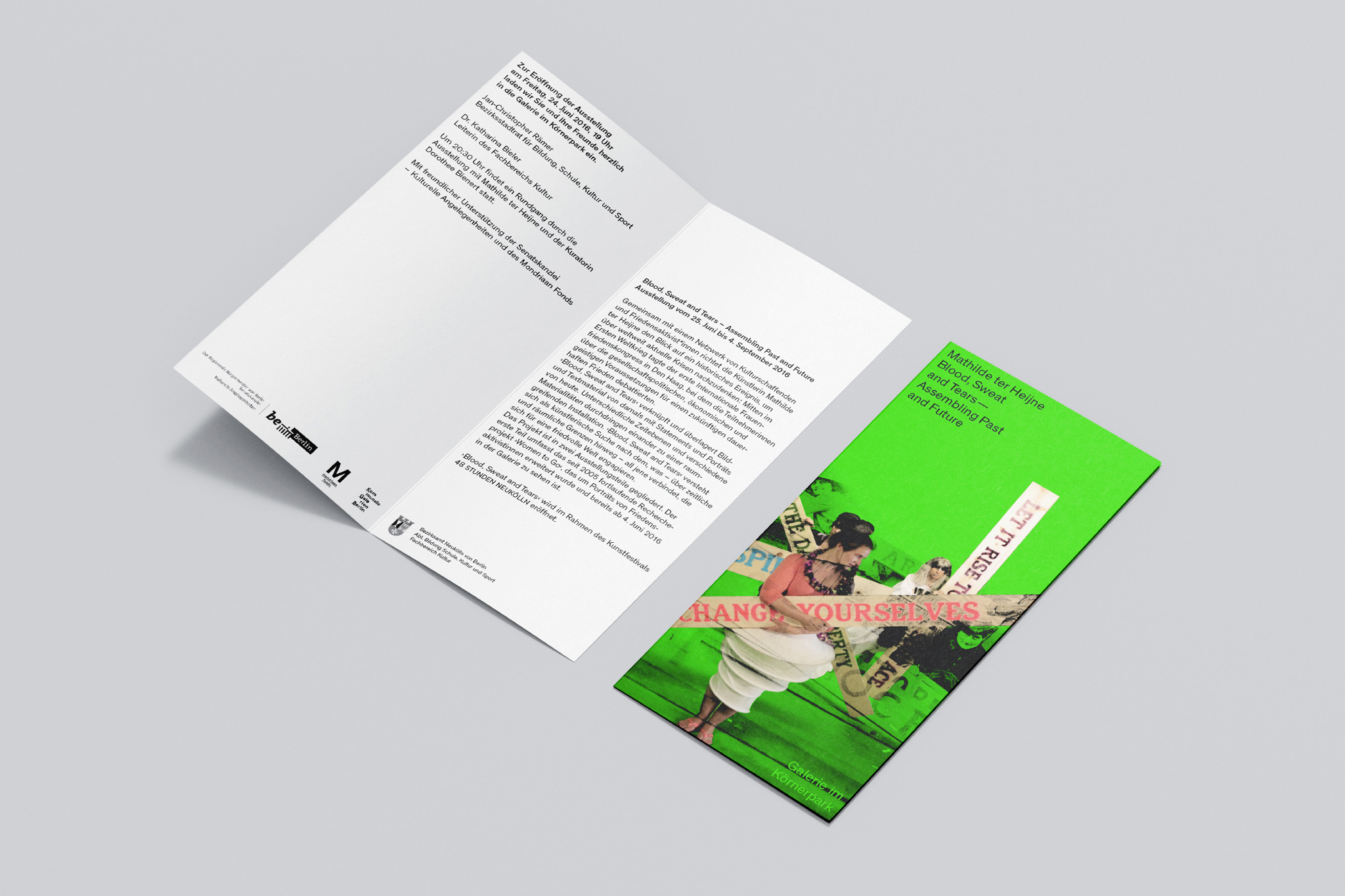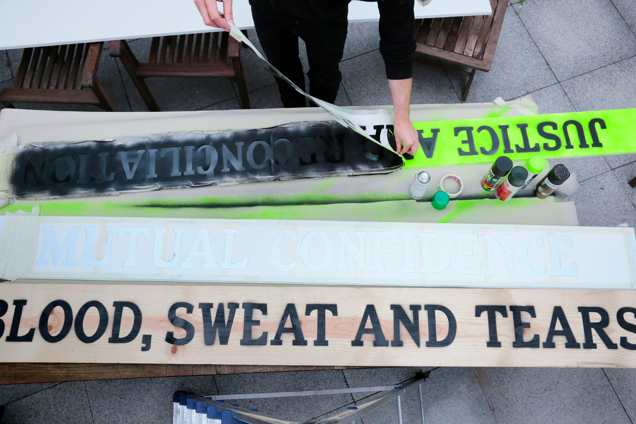 Historischer Anknüpfungspunkt für die Ausstellung »Blood, Sweat and Tears« der Künstlerin Mathilde ter Heijne in der Galerie im Körnerpark, Berlin ist der erste Internationale Frauenfriedenskongress 1915 in Den Haag, bei dem die Teilnehmer*innen über die gesellschaftspolitischen, ökonomischen und geistigen Voraussetzungen für einen zukünftig dauerhaften Frieden debattierten. Das historische Motiv zeigt US-amerikanische Frauen, die vor Ihrer Überfahrt nach Europa mit selbstgemachten Schildern demonstrieren. Diese Schilder wurden im Rahmen der Arbeit neu interpretiert.