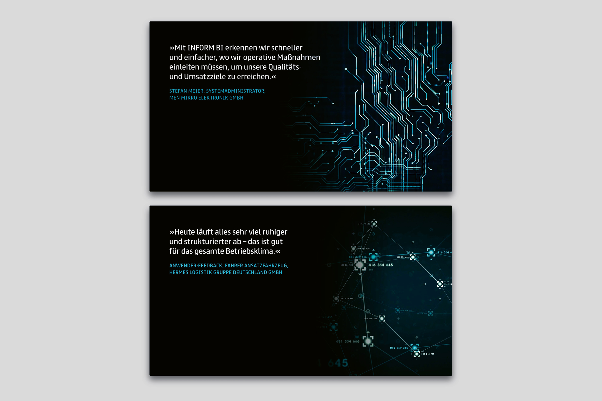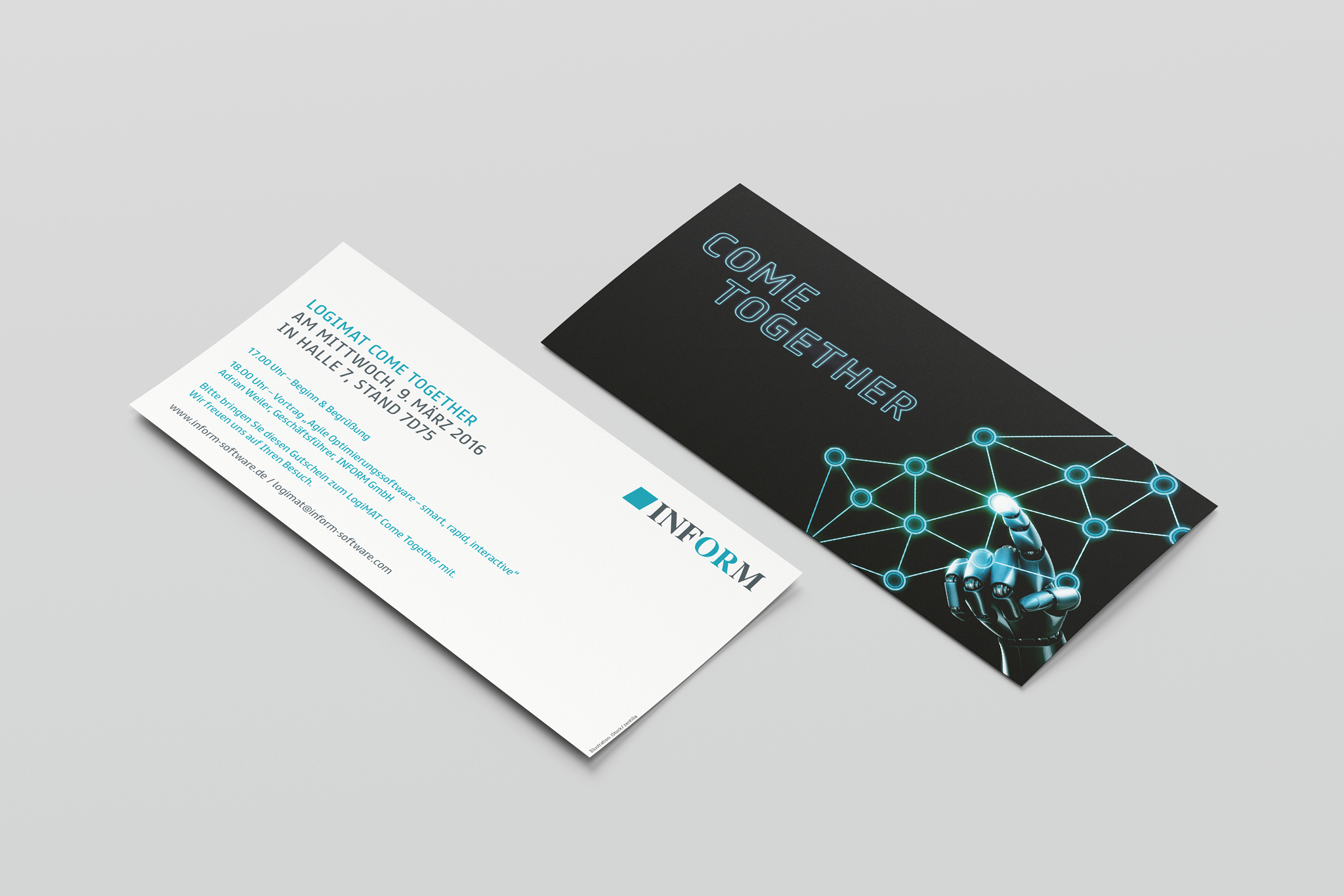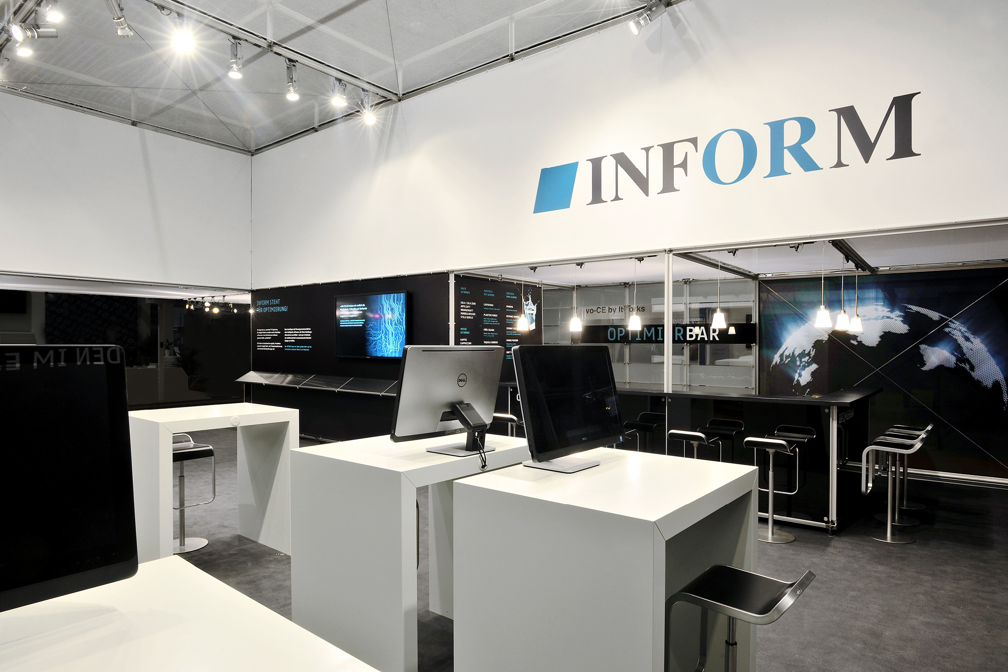 Entwicklung und Ausarbeitung der Grafik eines 140 qm Insel-Messestandes für das Software-Unternehmen INFORM auf der LogiMAT 2016 in Stuttgart. Der Stand informiert über die vier Geschäftsbereiche Inventory & Supply Chain, Industrielogistik, Produktion und Logistik. Neben der Aufgabe, auf den INFORM-Stand aufmerksam zu machen und einführend über das Unternehmen zu informieren soll der Auftritt vor allem einen geschützten Raum für 9 Infoterminals bieten, an denen die komplexen Software-Lösungen im Rahmen von längeren Beratungsterminen erläutert werden können. Darüber hinaus wurde eine zur Standgrafik passende digitale Präsentation mit Kundenaussagen sowie eine Einladung und Getränkekarte für die Standparty gestaltet. Der Messebau wurde von Boldt Messeservice Aachen betreut.