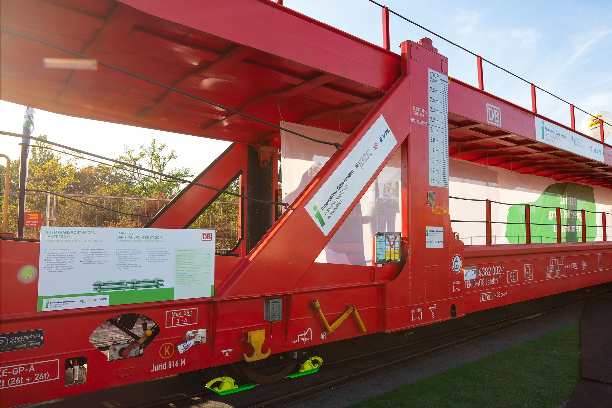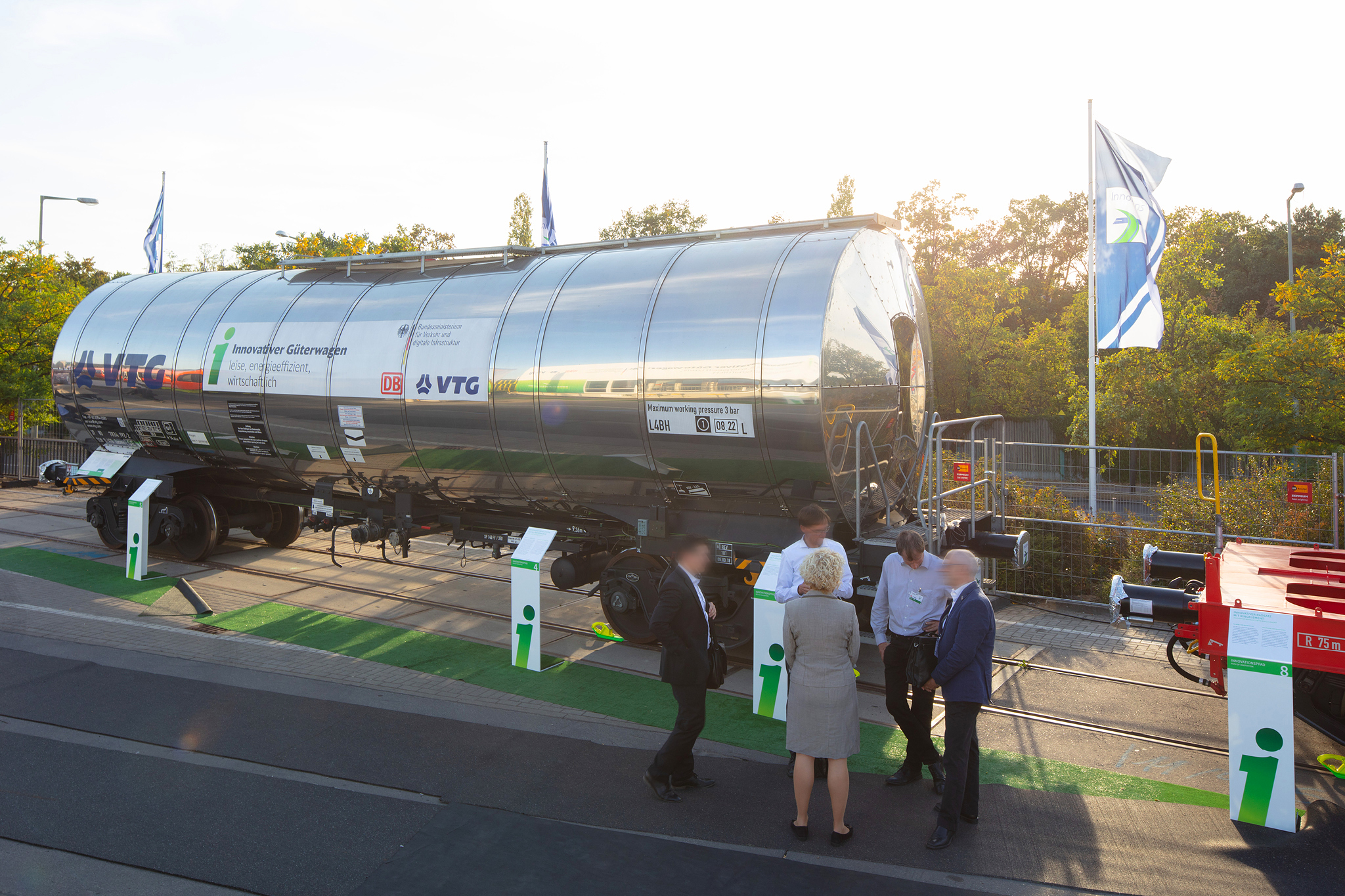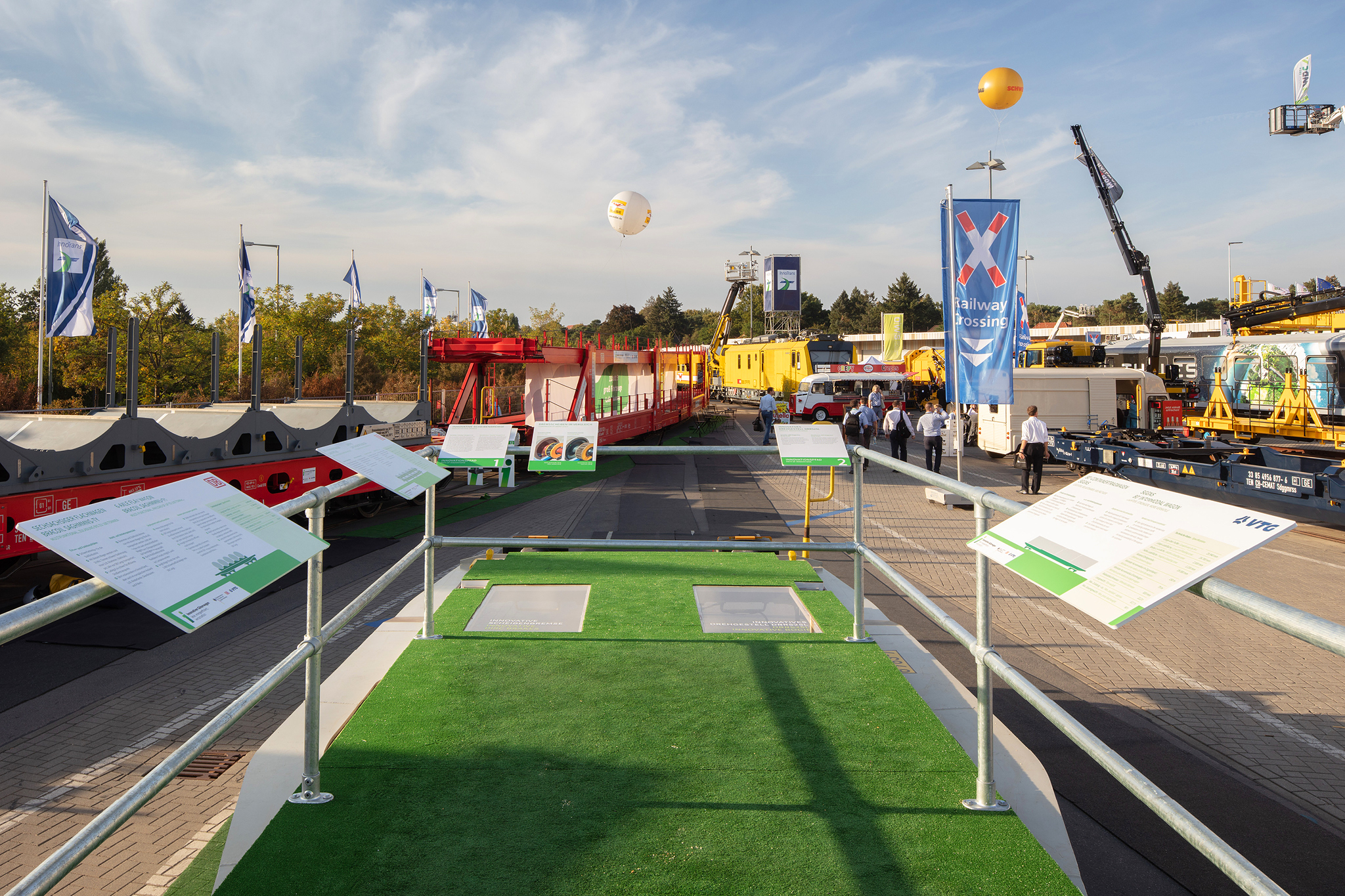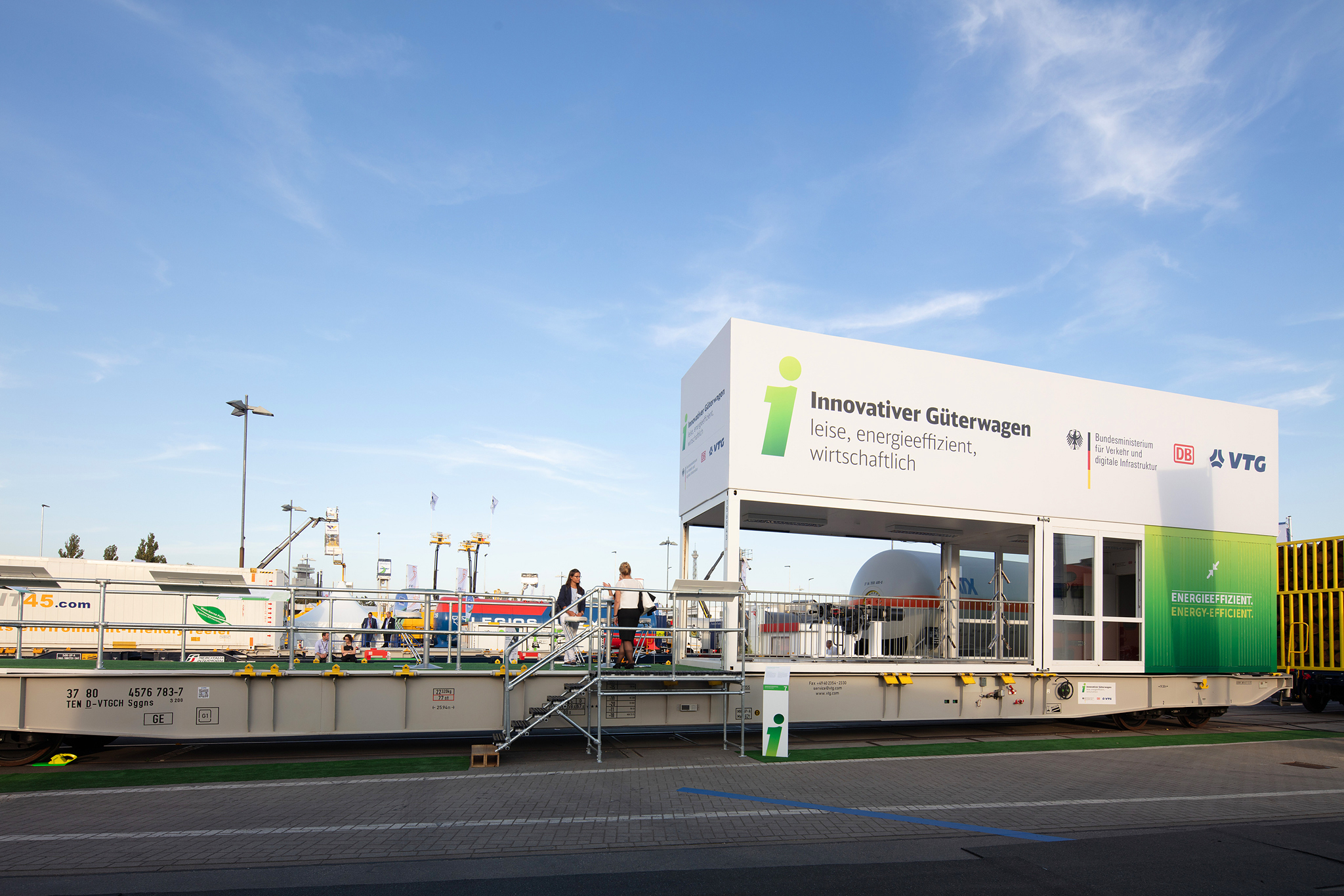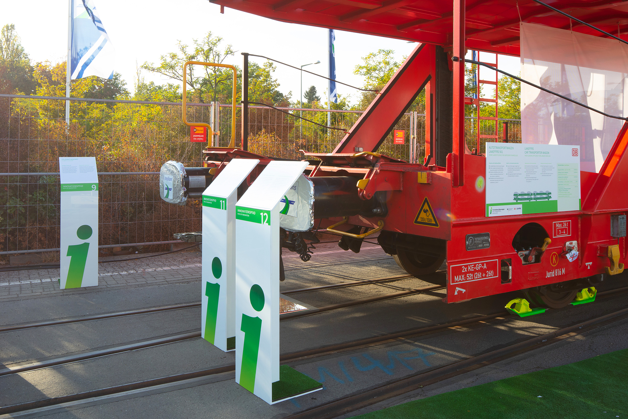 Auf dem Außengelände der InnoTrans wurden 3 Innovative Güterwagen und ihre Komponenten vorgestellt. Der neue Containertragwagen dient als Aussichtsplattform mit Besprechungsbereich und einer kleinen Ausstellung. Banner, Schautafeln und Aufsteller informieren über alle neuen Komponenten. Eine 40seitige Infobroschüre fast alle Informationen für die Besucher zusammen.
