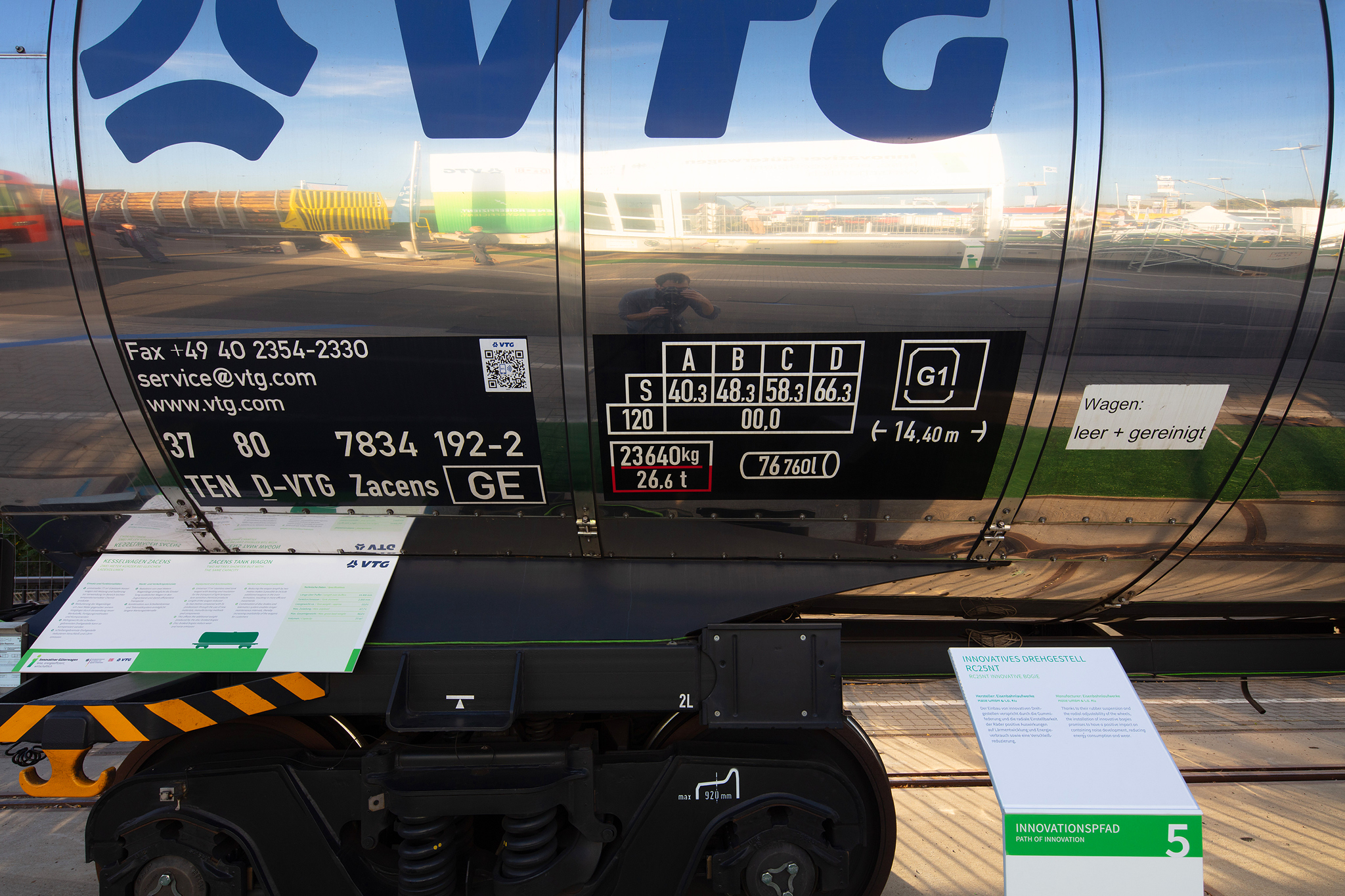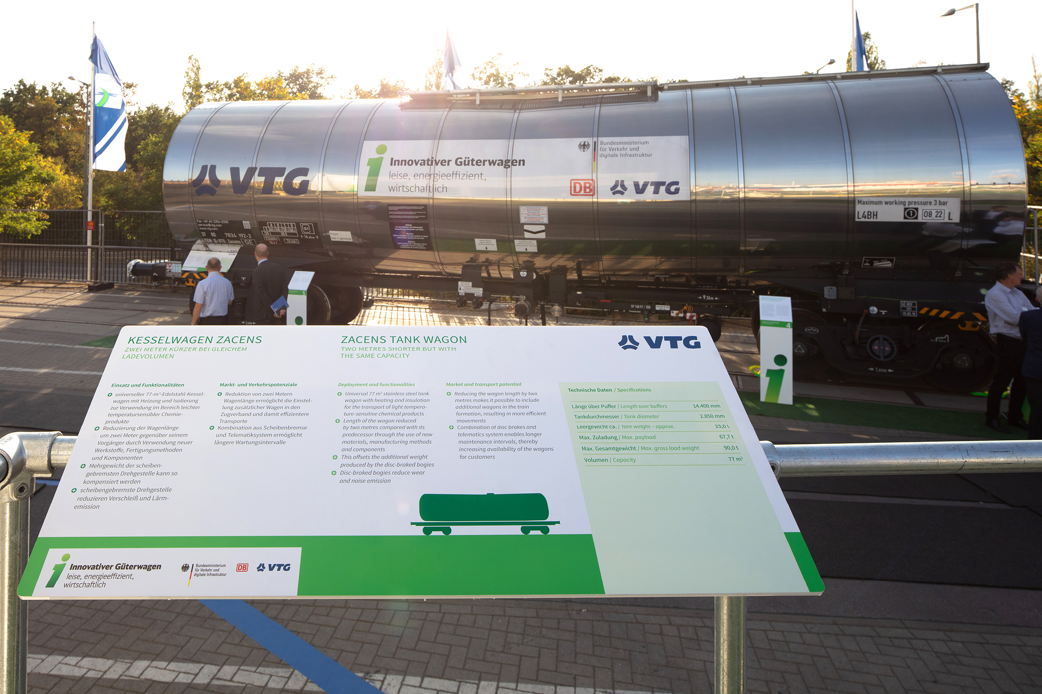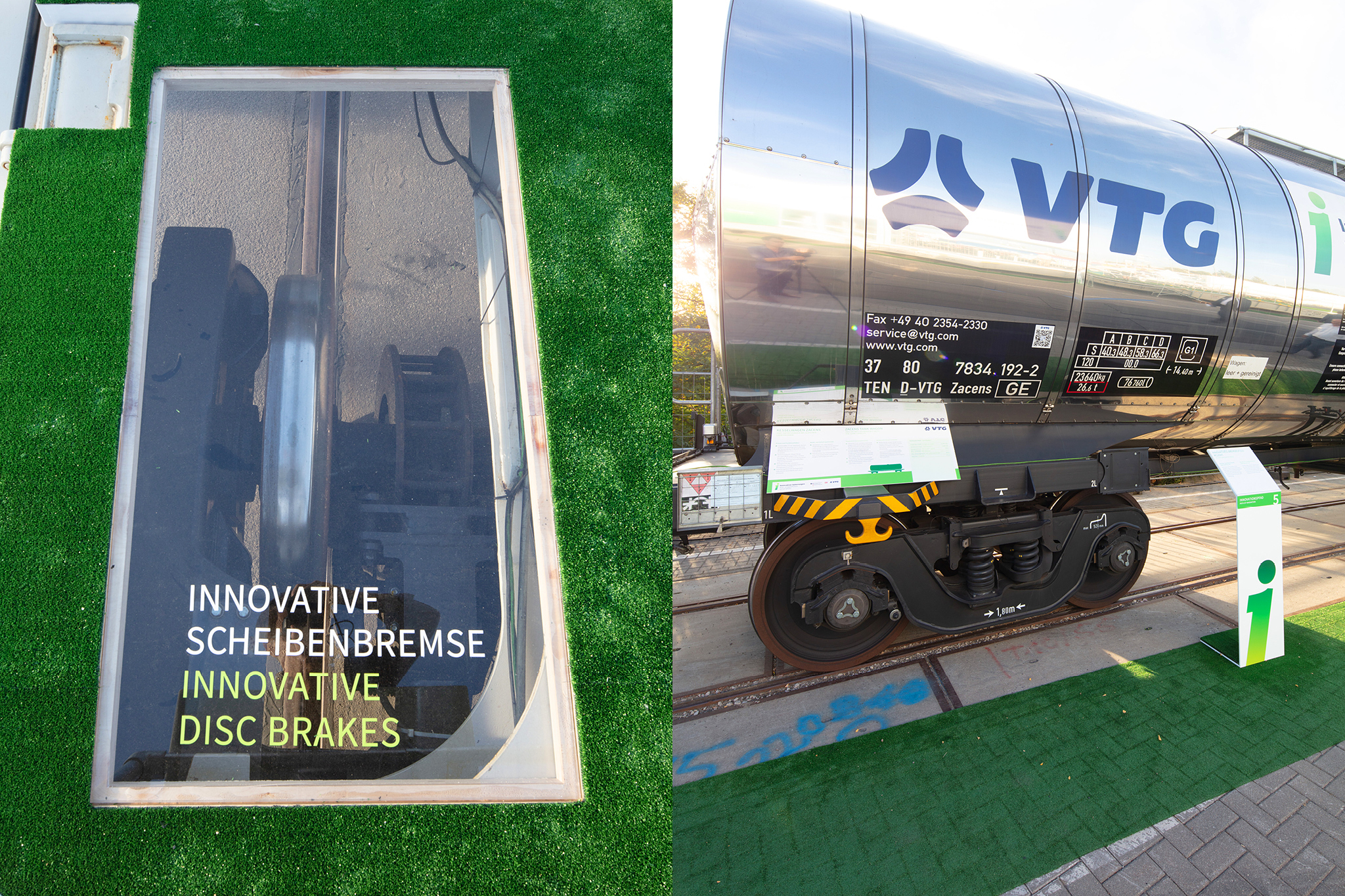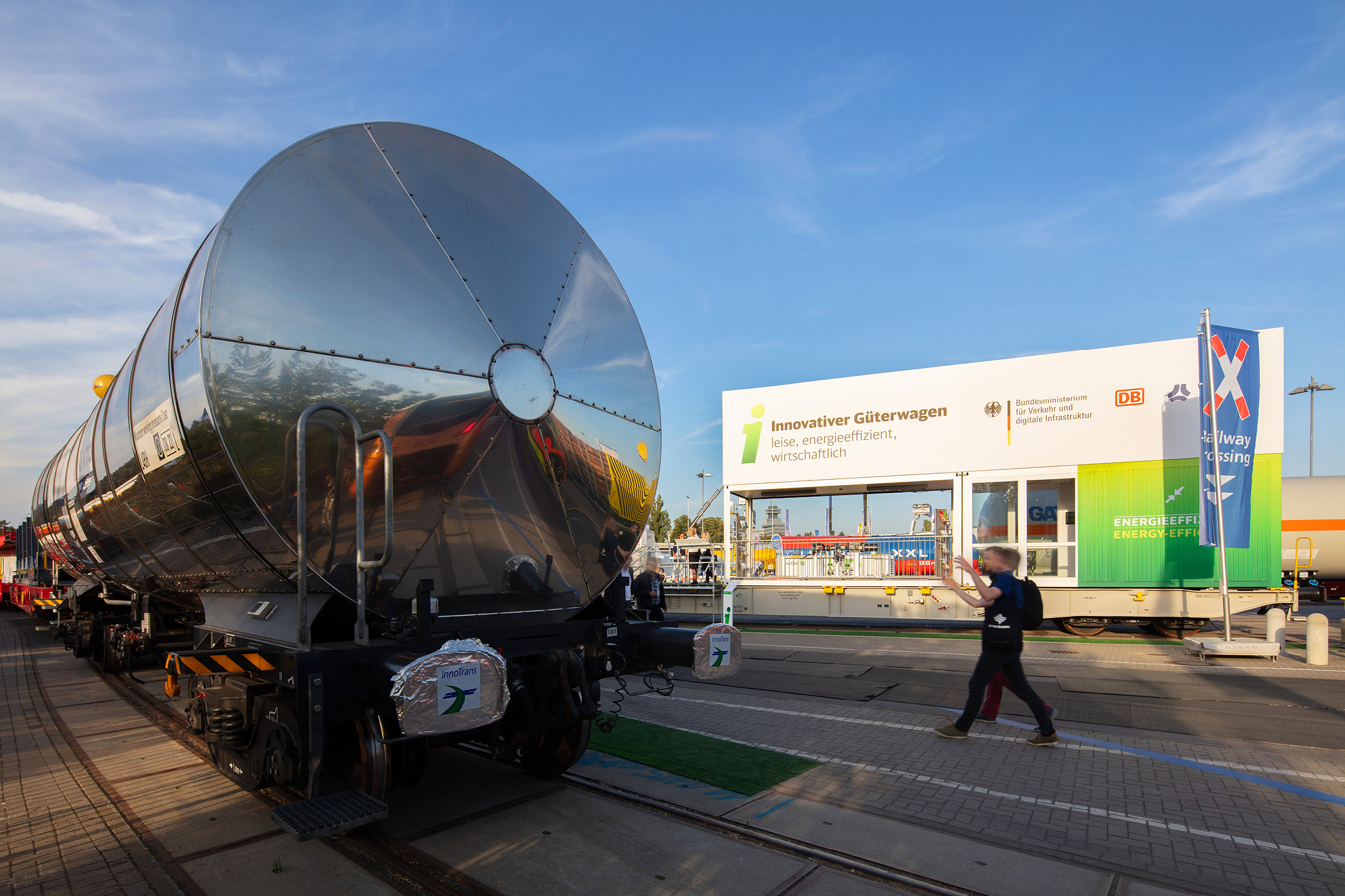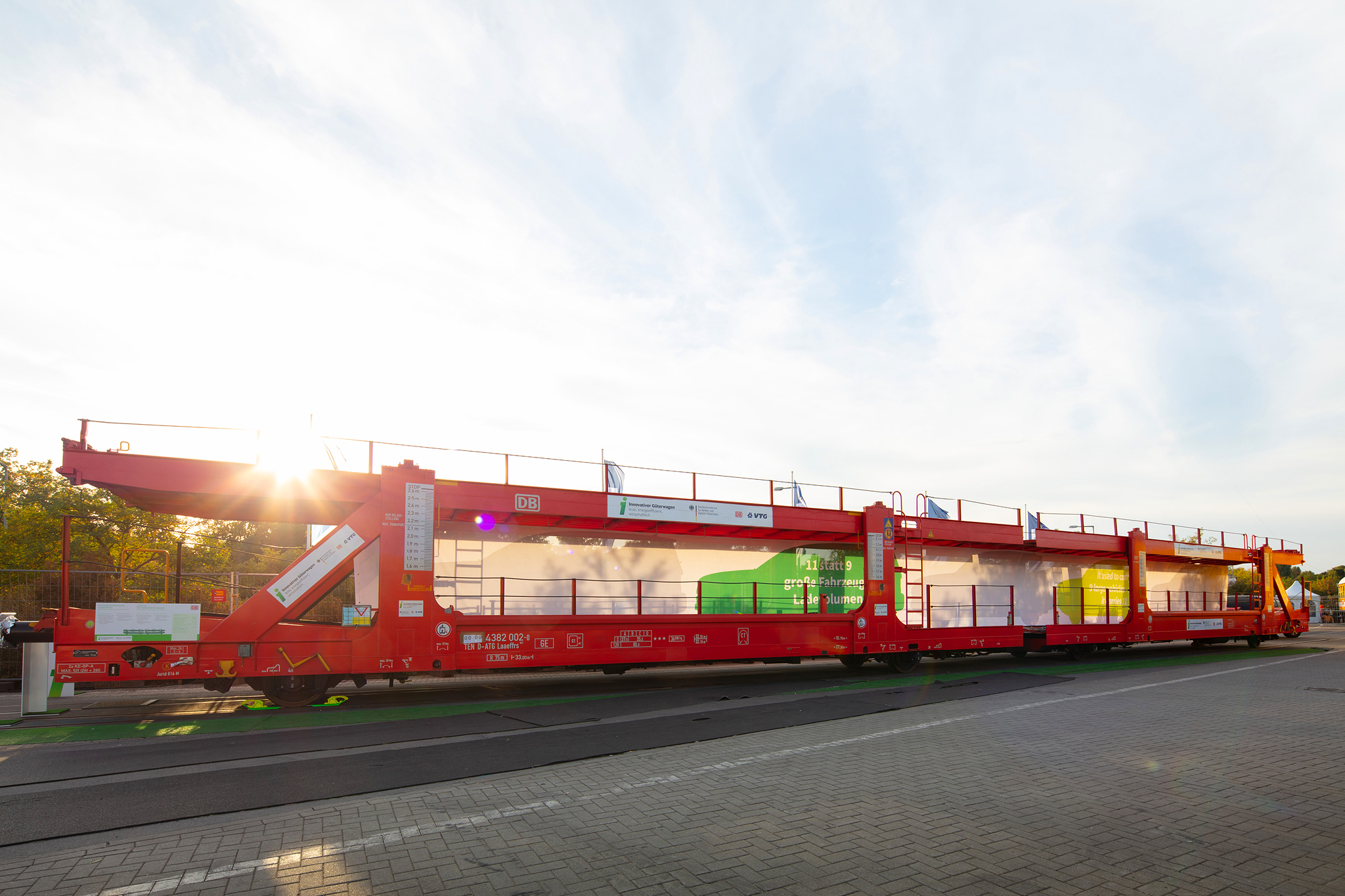 Auf dem Außengelände der InnoTrans wurden 3 Innovative Güterwagen und ihre Komponenten vorgestellt. Der neue Containertragwagen dient als Aussichtsplattform mit Besprechungsbereich und einer kleinen Ausstellung. Banner, Schautafeln und Aufsteller informieren über alle neuen Komponenten. Eine 40seitige Infobroschüre fast alle Informationen für die Besucher zusammen.