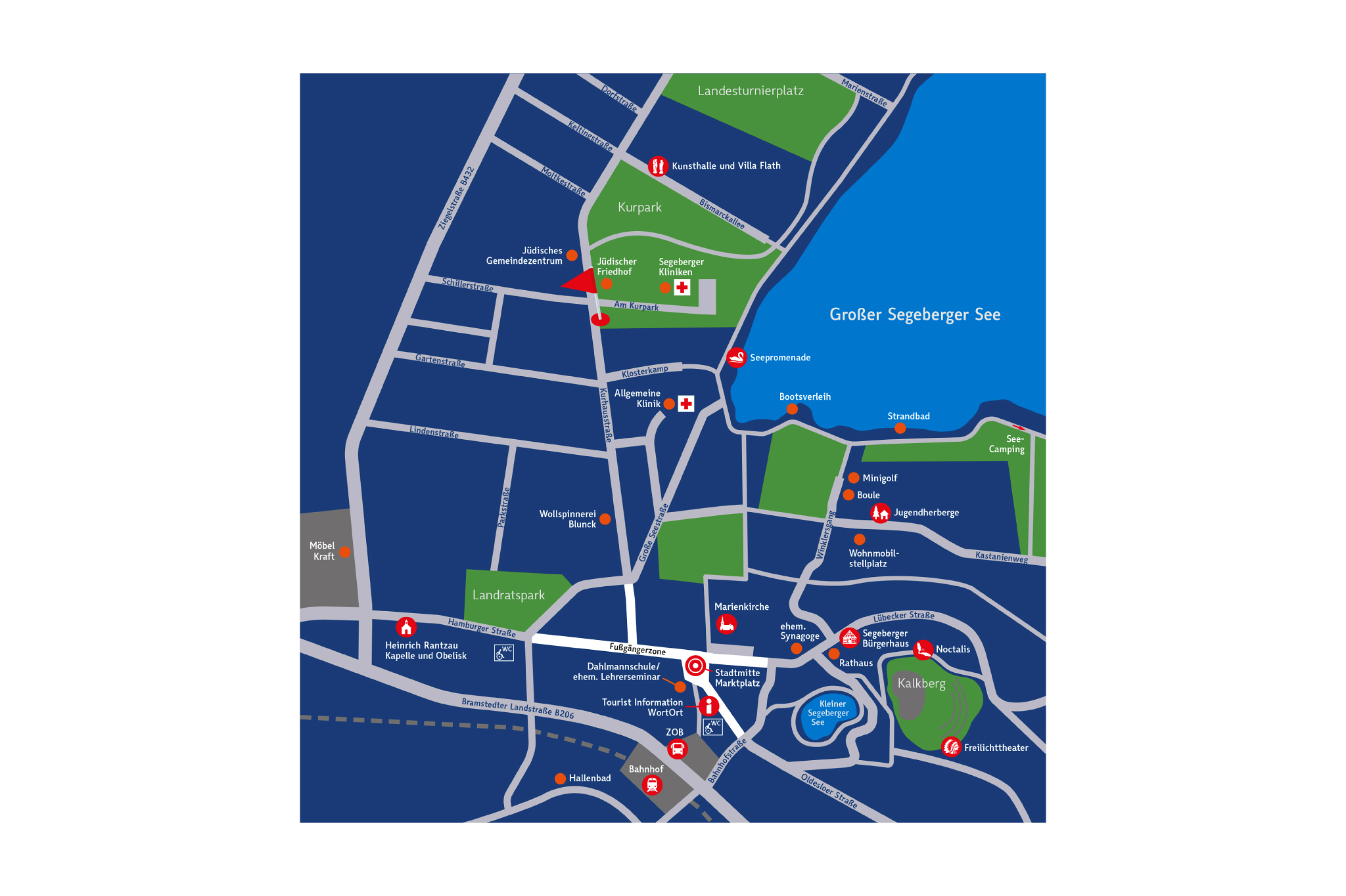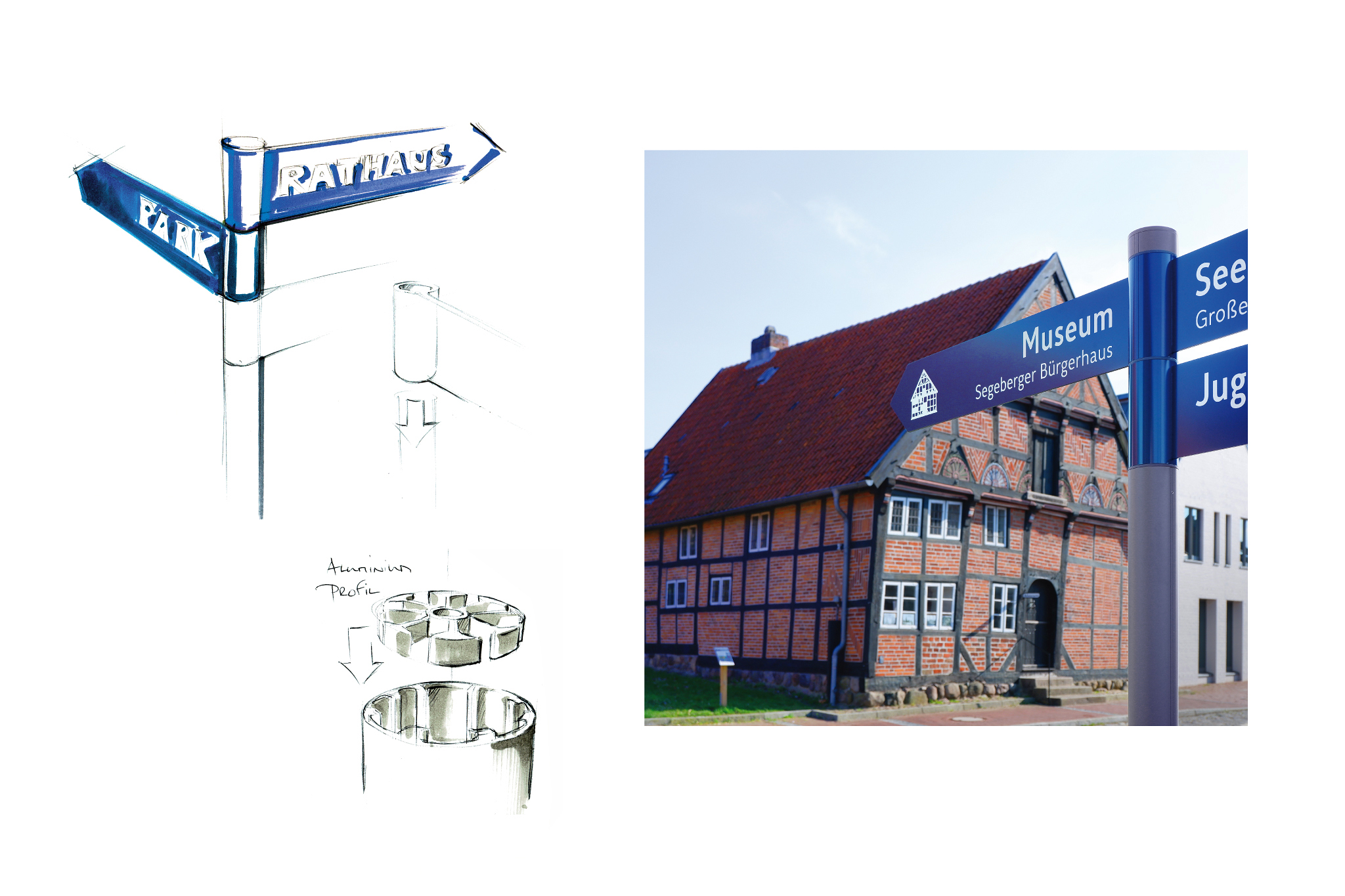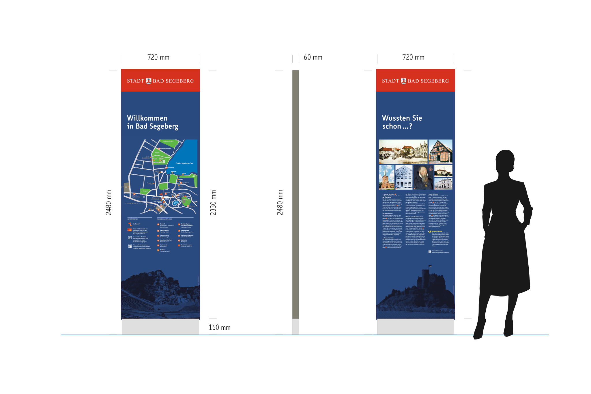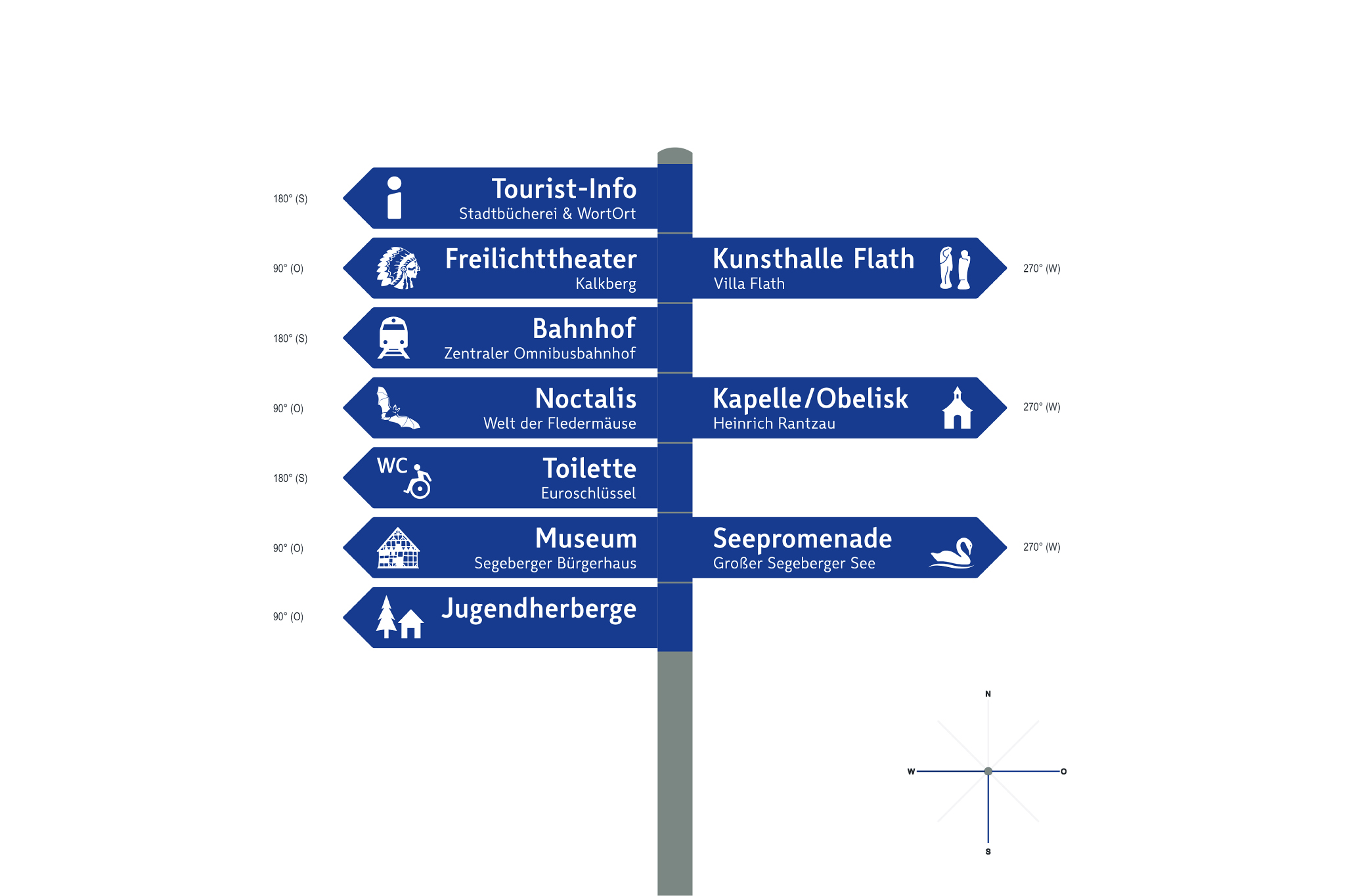 Für jedes Ziel entstand ein eigenes Piktogramm. Dabei wurde besonderer Wert auf Erkennbarkeit und Lesbarkeit gelegt, um eine barrierefreie Zugänglichkeit zu unterstützen. Neben den 14 Wegweisern im Stadtgebiet sind an besonders prominenten Stellen, wie etwa dem Bahnhof und dem Marktplatz, beidseitig bespielte Stelen gestaltet worden. Diese zeigen auf der einen Seite einen besonders übersichtlichen Stadtplan mit allen Zielen und weiteren wichtigen Orten in Bad Segeberg. Die Rückseite bringt interessante Orte und Ereignisse aus dem direkten Umfeld der jeweiligen Stele näher – durch extra von einer Autorin verfasste Texte sowie zeitgenössische und historische Bildern.