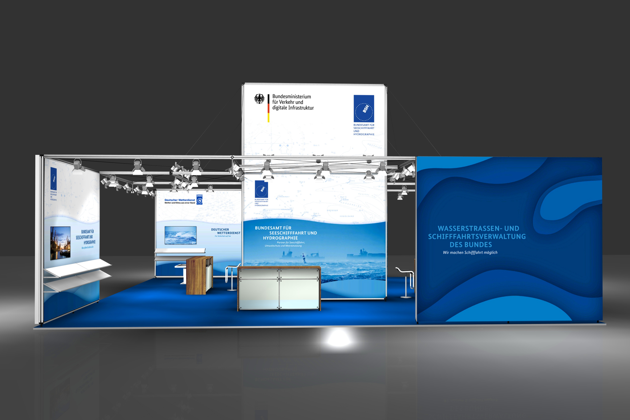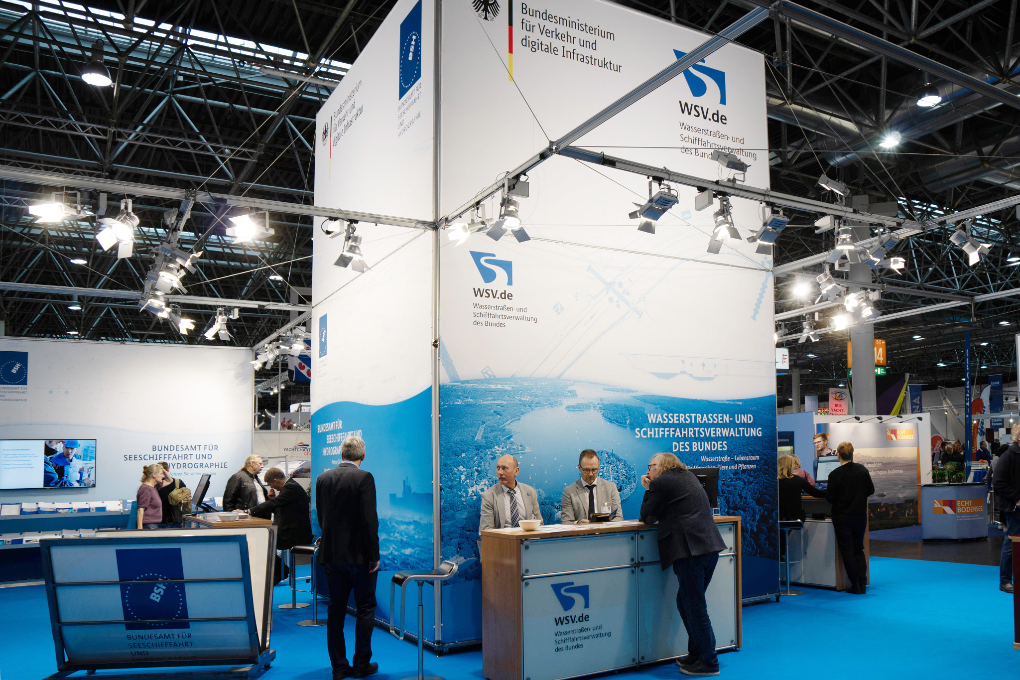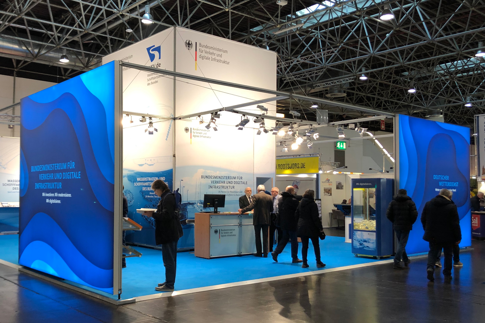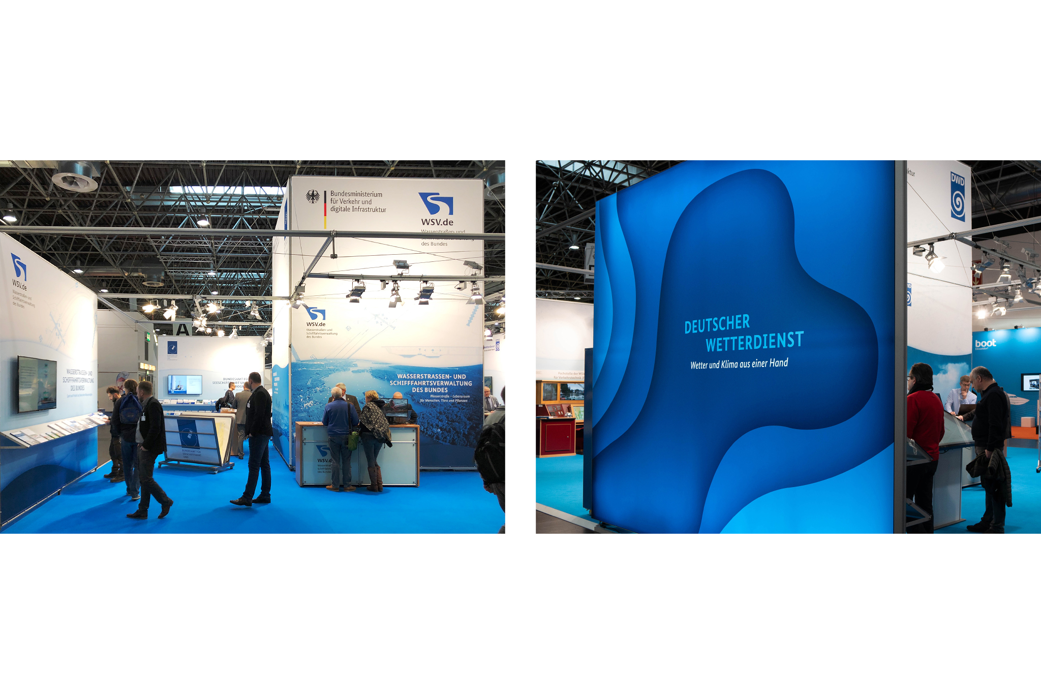 Der Stand informiert über die Aktivitäten des Ministeriums und seiner Behörden Wasserstraßen- und Schifffahrtsverwaltung (WSV), Deutscher Wetterdienst (DWD) und Bundesamt für Seeschifffahrt und Hydrographie (BSH). Außen wird der an der Hobbyschifffahrt interessierte Besucher mit abstrahierten Wassermotiven interessiert. Innen informiert der Stand über die für Wassersportler essentiellen Leistungen der Behörden – Wetterdienst, Kartographie und Organisation der Wasserstraßen.