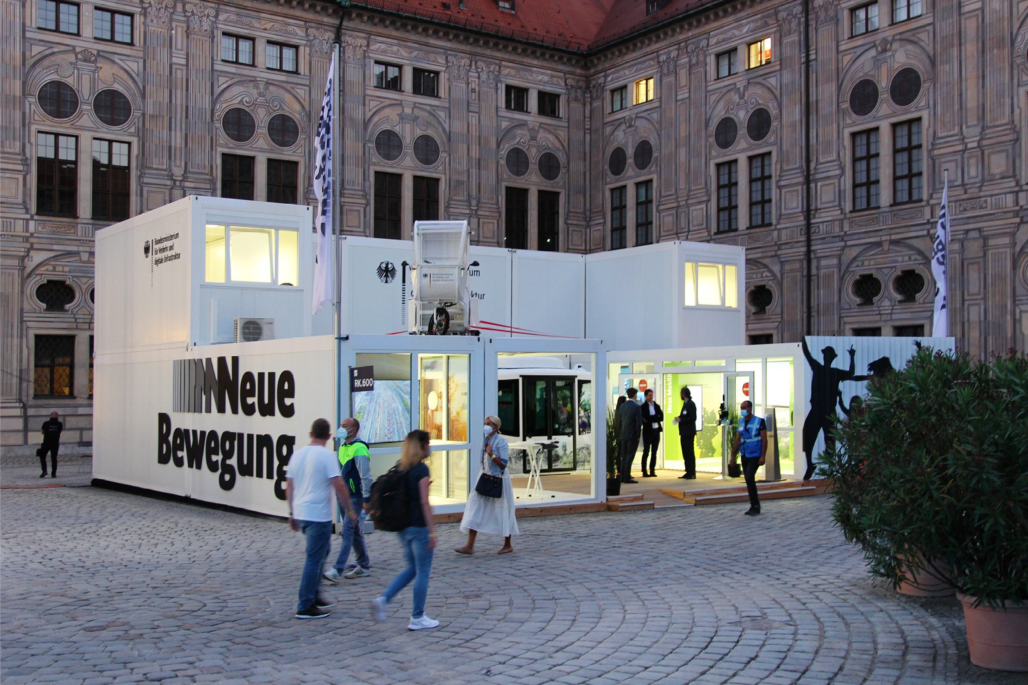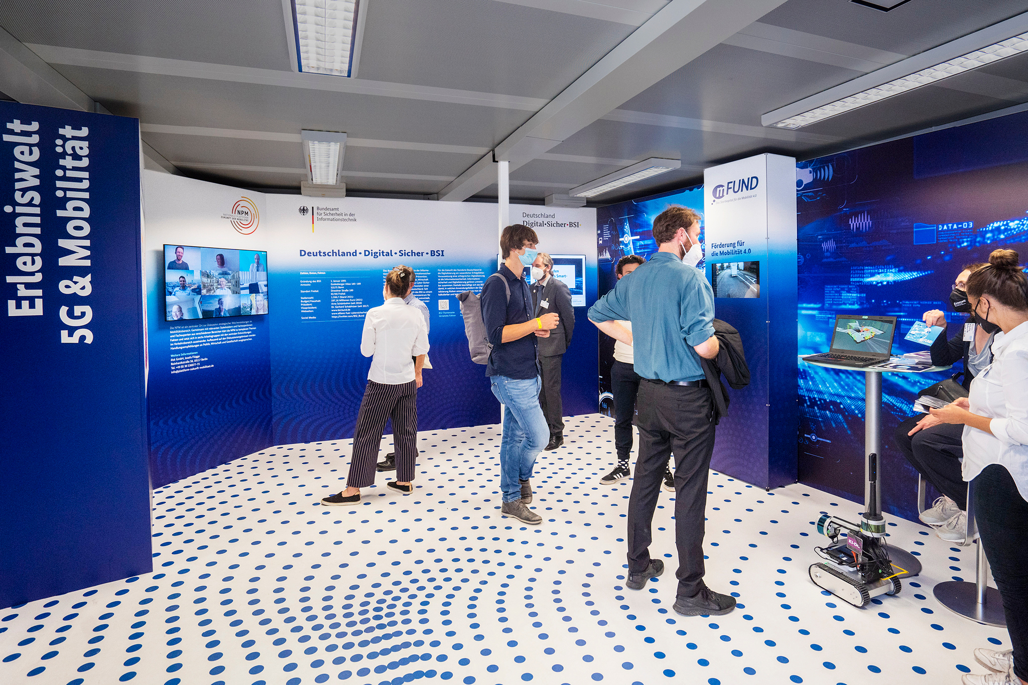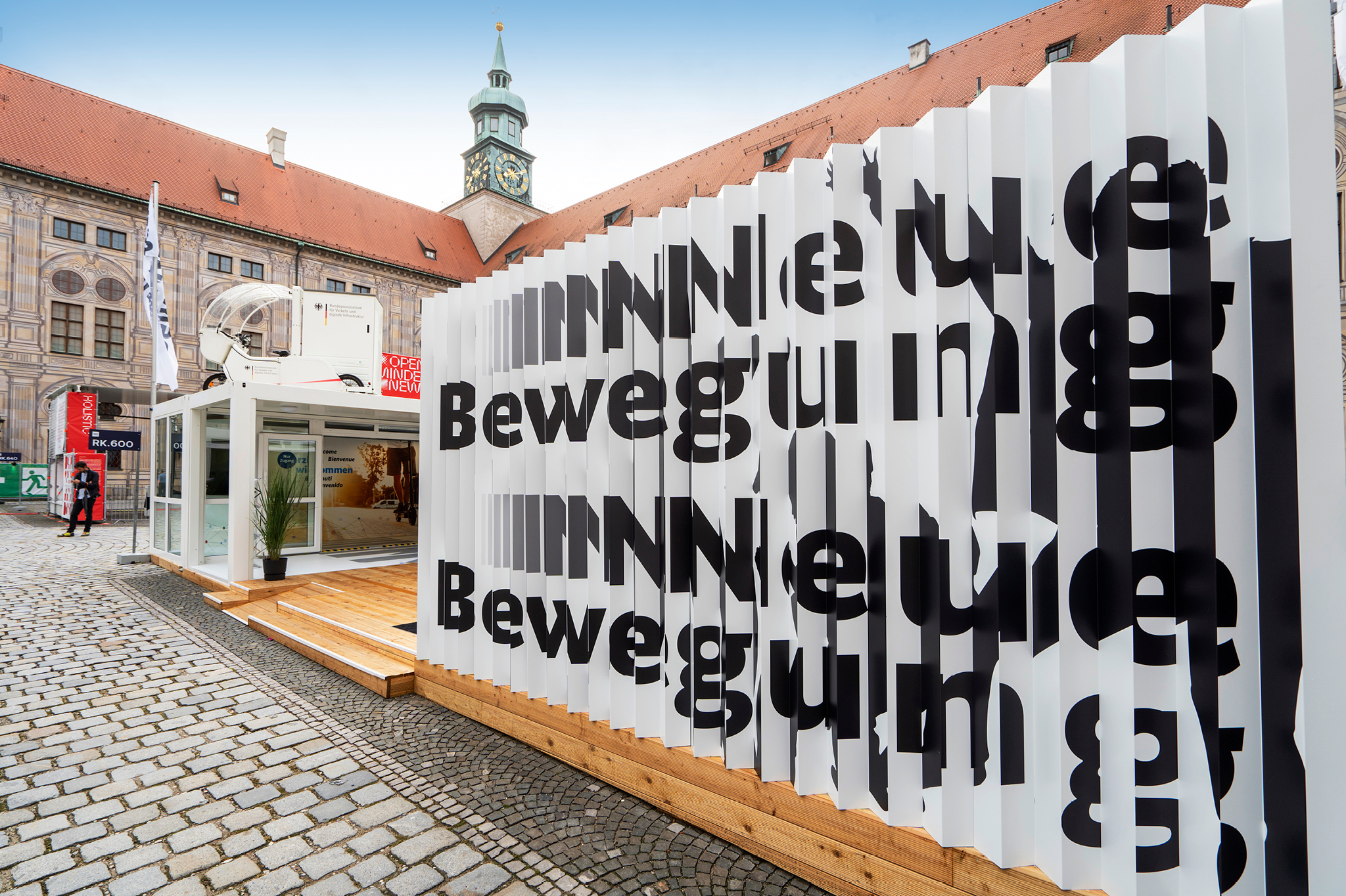 Der aus Baucontainern errichtete Stand im Kaiserhof in der Münchner Innenstand ist Teil der »Open Spaces«, mit denen die IAA Mobility mit speziellen Ausstellungs- und Erlebnisflächen jenseits des Messegeländes neue Wege geht. In den drei Themenwelten BMVI, 5G und Neue Mobilität können sich Besucher über eine Vielzahl von Projekten und Initiativen informieren und die präsentierten Technologien auch direkt ausprobieren.