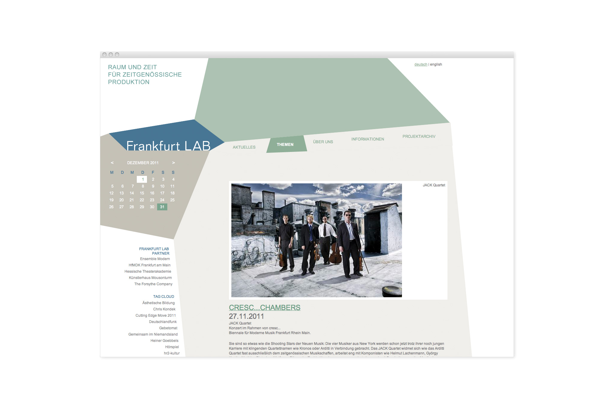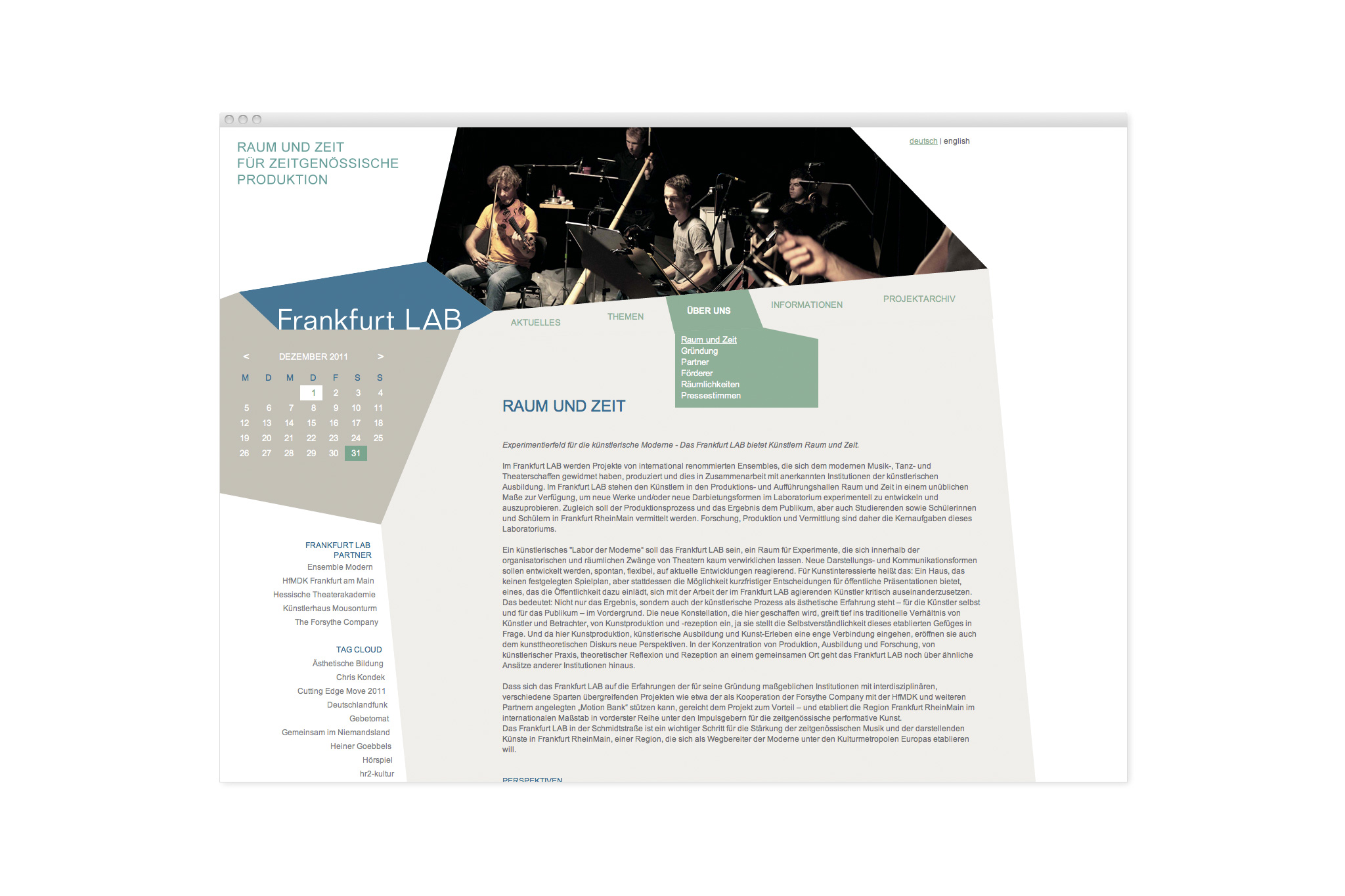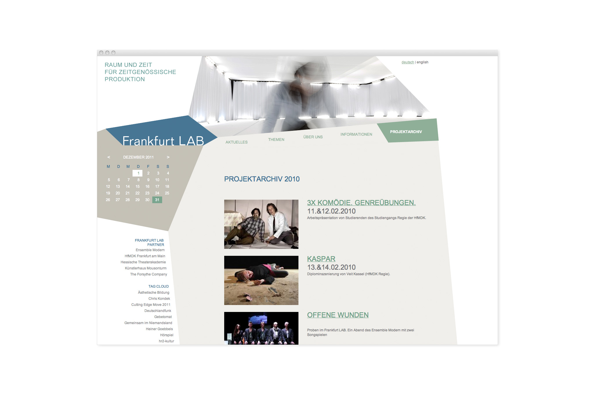 Das Frankfurt LAB ist kein klassischer Veranstaltungsort, sondern ein Raum, in dem Künstler und Studenten Raum und Zeit finden, genre-übergreifend Neues zu entwickeln. Die Website versucht, diesen offenen Charakter mit einer Blogstruktur abzubilden, die viele Möglichkeiten des Einstiegs bietet und themenspezifisch über alle Aktivitäten informiert. Im Lauf der Zeit entsteht so auch ein umfangreiches Projekt-Archiv, das die Arbeit des LAB dokumentiert.