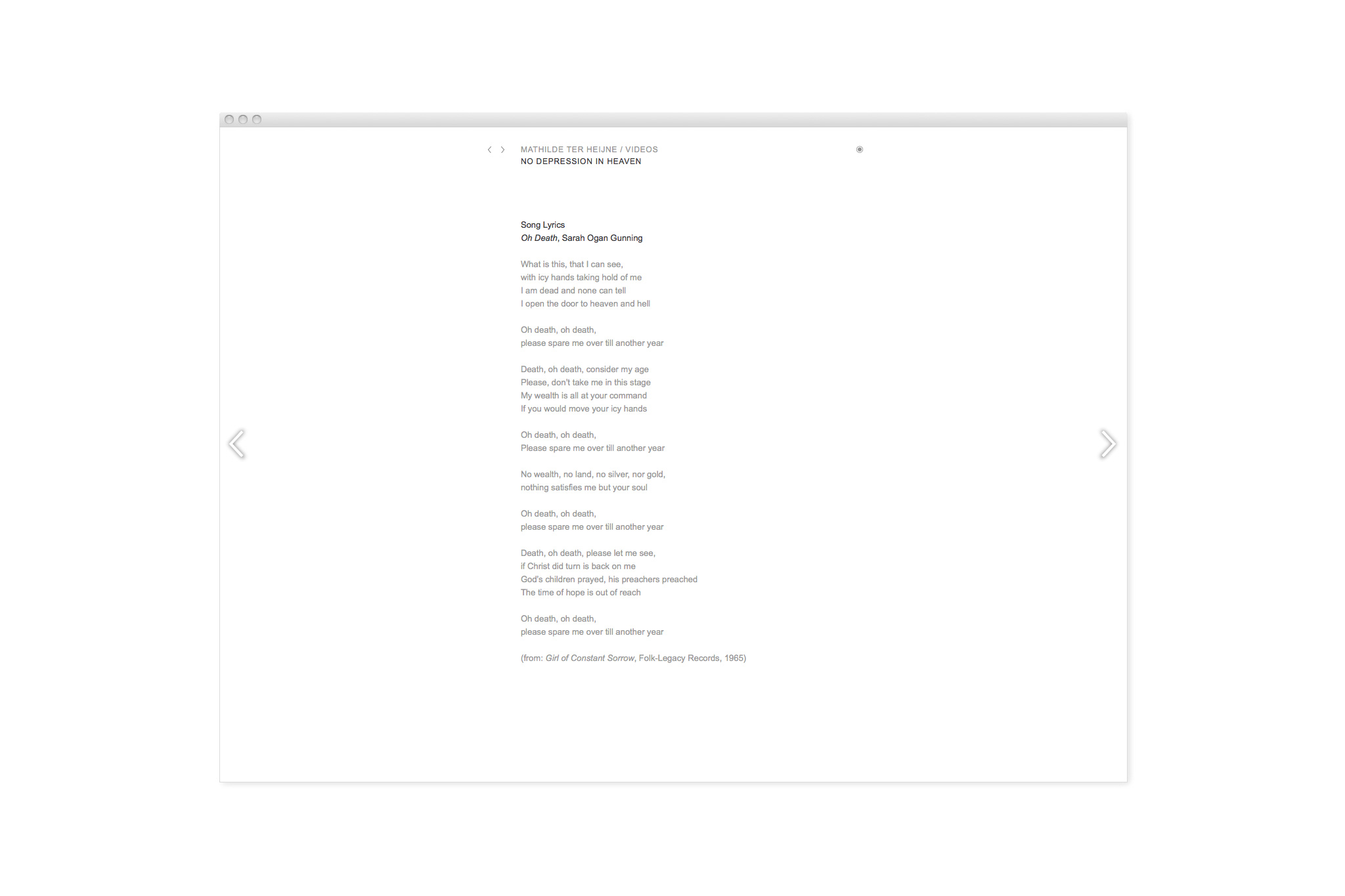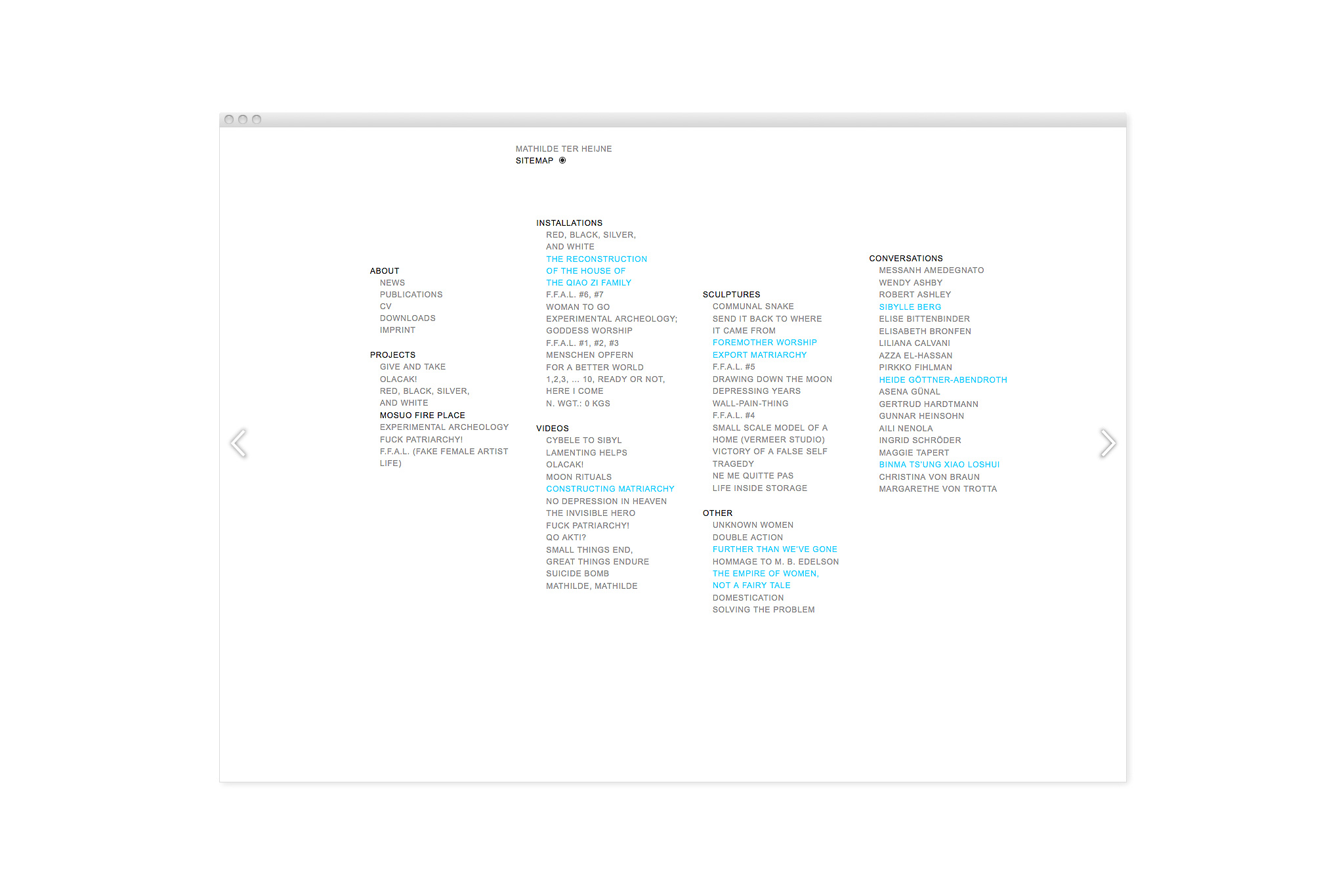 Die Arbeiten der Künstlerin Mathilde ter Heijne haben viele Ebenen. Videos, Skulpturen und Installationen gehören zu Werkgruppen, die durch umfangreiche Hintergrundrecherchen, ›Conversations‹ und Texte miteinander verknüpft sind. Das Konzept der Website versucht, diese Tiefe und Vernetzung zu verdeutlichen und zugänglich zu machen. Für alle Inhaltsformate gibt es spezifische Templates, die für jede Arbeit ringförmig angeordnet sind. Eine in jedem Ring enthaltene Sitemap bietet einen Überblick über alle Inhalte.