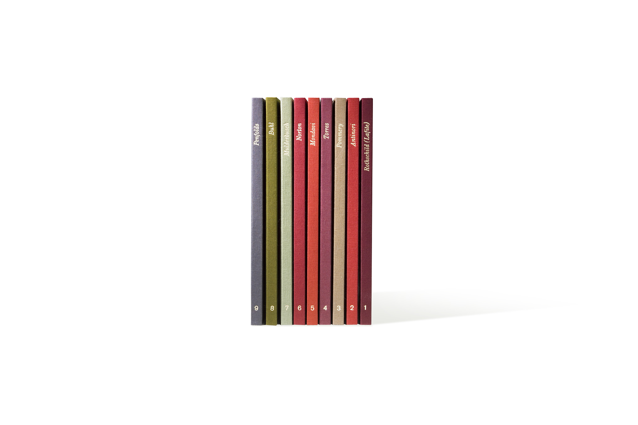Covergestaltung von 9 leinengebundenen Bänden in unterschiedlichen Farben, mit passendem Vorsatz und eingelegtem Schildchen