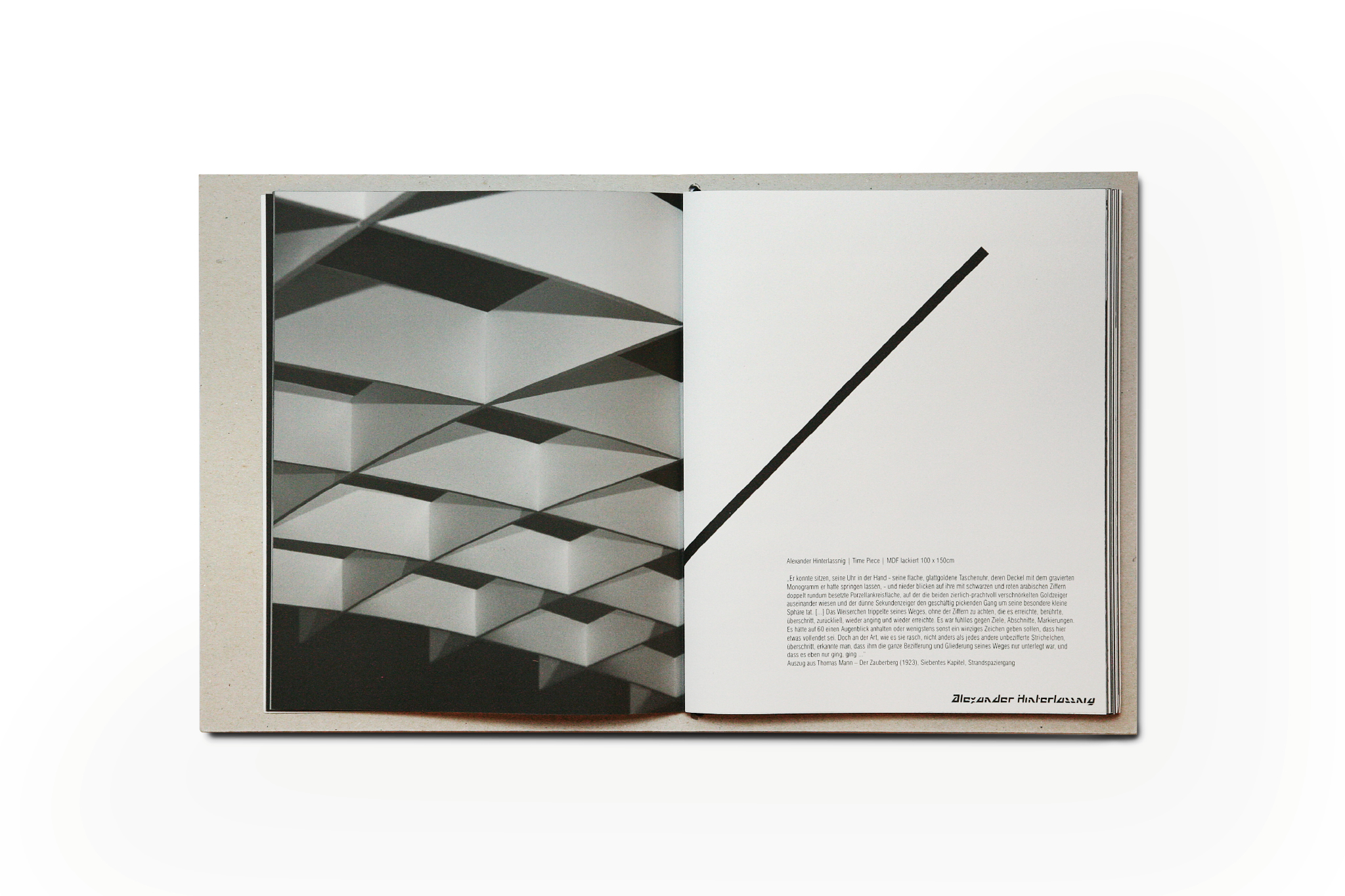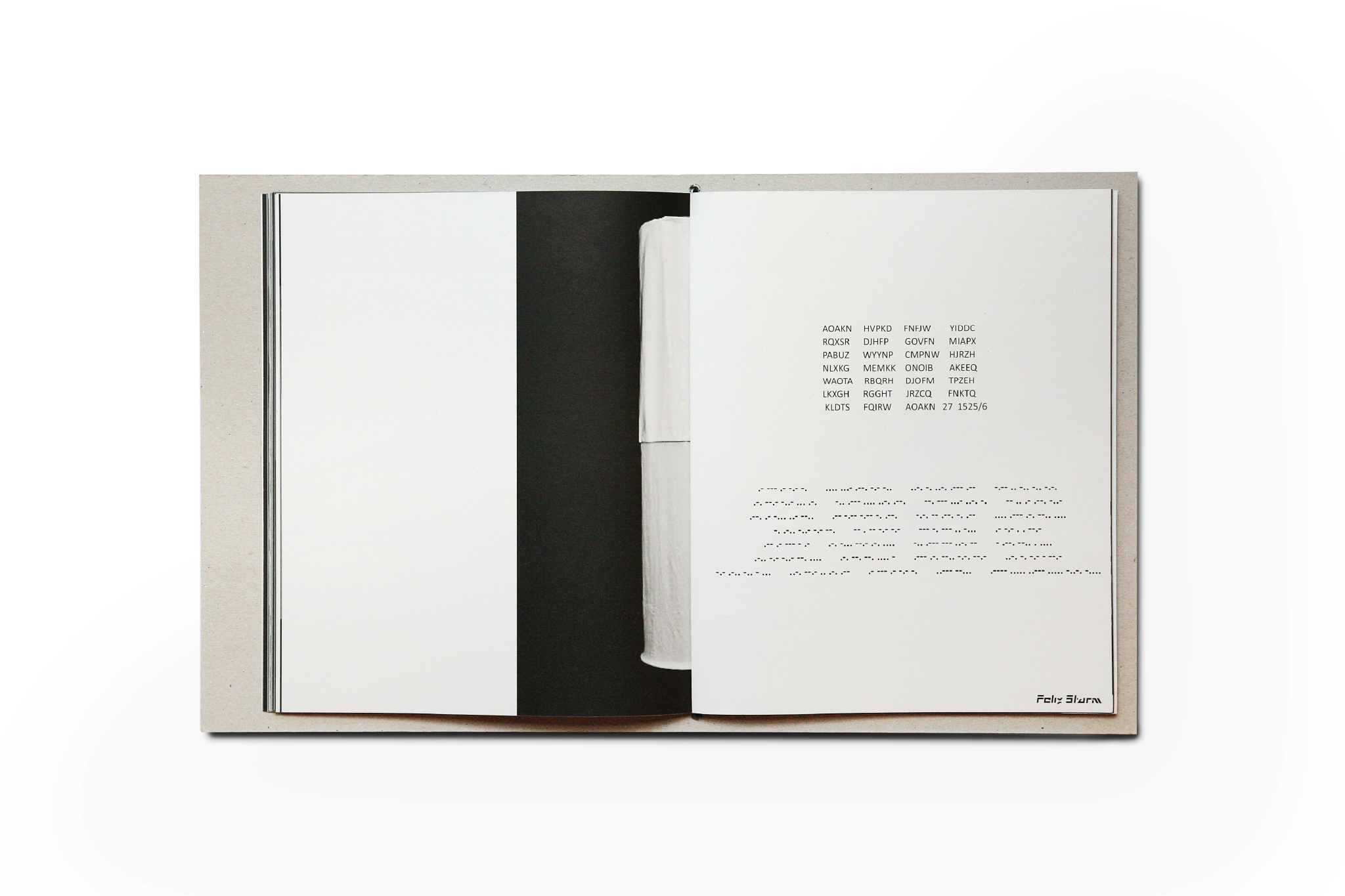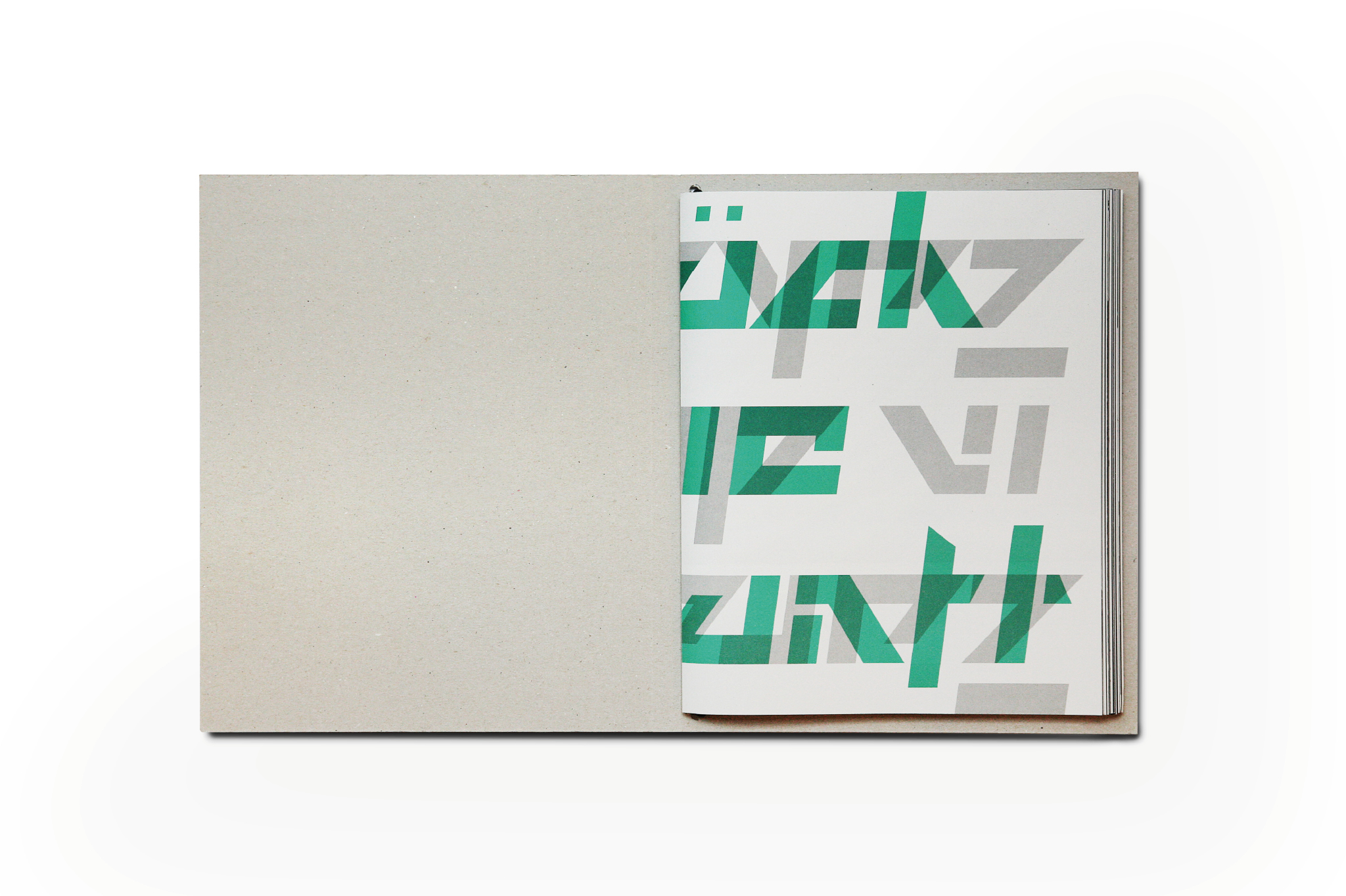 Für das Buch erstellten alle Studierenden jeweils ein beidseitig bedrucktes Blatt, das nach dem Druck mittig gefaltet wurde und gemeinsam mit den restlichen Blättern in den Umschlag aus 2 mm Maschinengraukarton eingelegt wurde. Durch das jeweils individuelle Falten, Ein- und Zusammenlegen der vierseitigen Bögen wird jedes Buch zum Unikat mit unzähligen Seitenkombinationen.